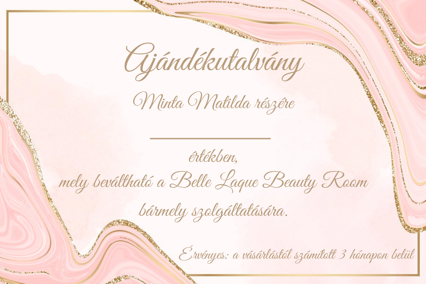 Válaszd a Belle Laque Beauty Room ajándékutalványát, amelyet akár online is megvásárolhatsz. Az ajándékkártya bármely szolgáltatásra beváltható és tetszőleges összeggel feltölthető, a vásárlástól számított 3 hónapon belüli felhasználási idővel.